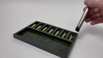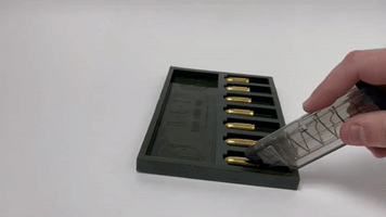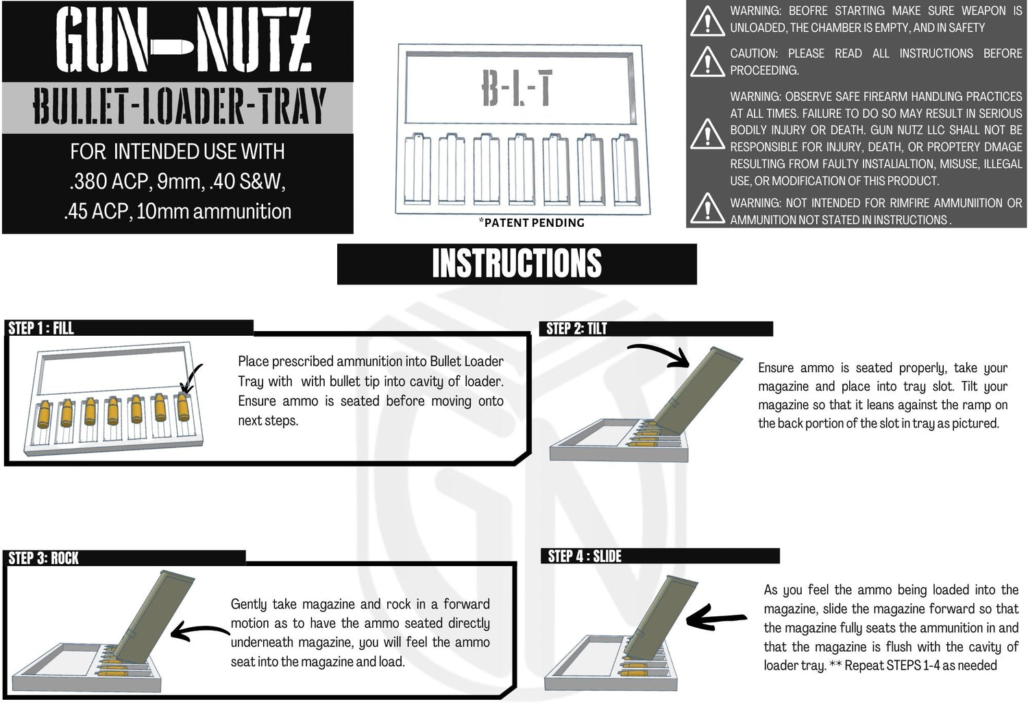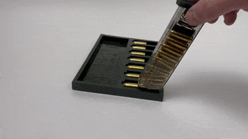 TILTEnsure ammo is seated properly, take your magazine and place into tray slot. Tilt your magazine so that it leans against the ramp on the back portion of the slot in tray as pictured.